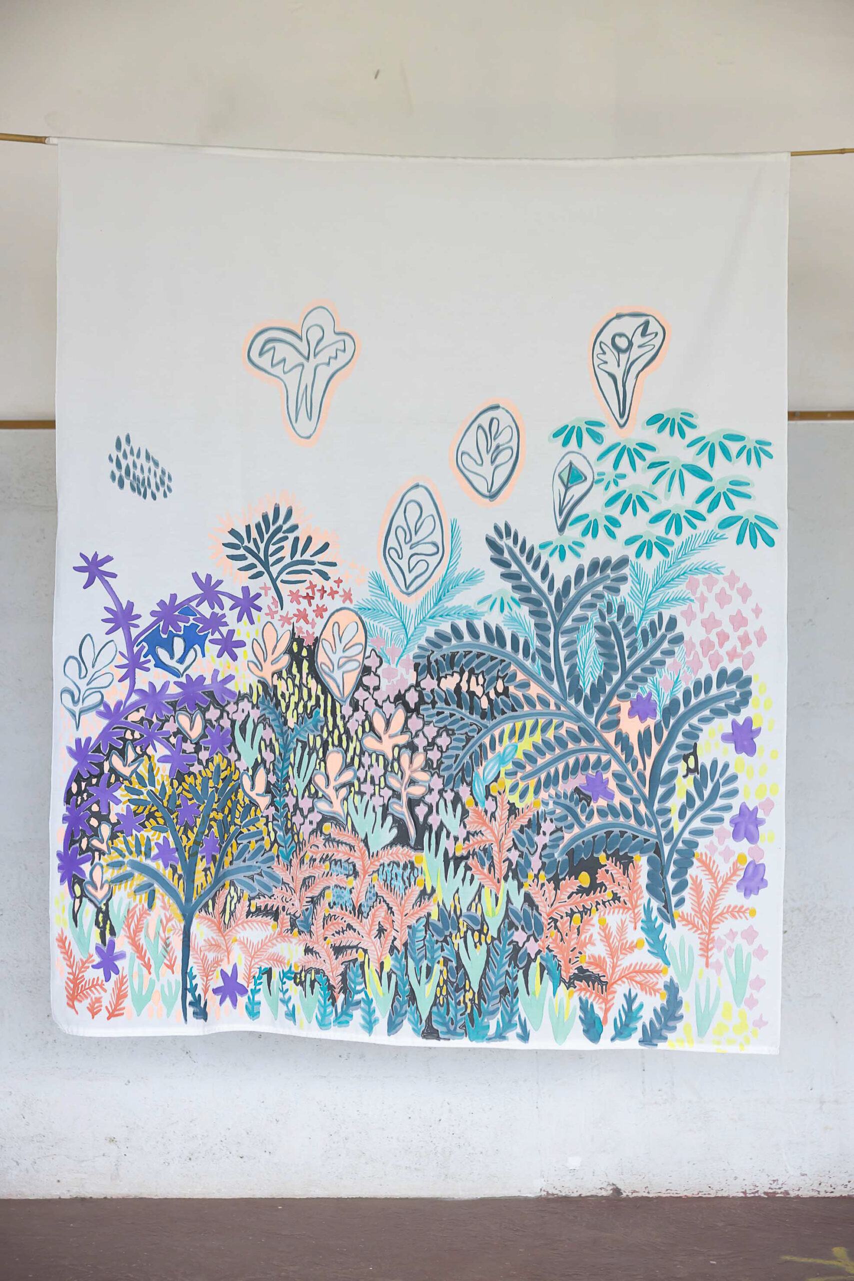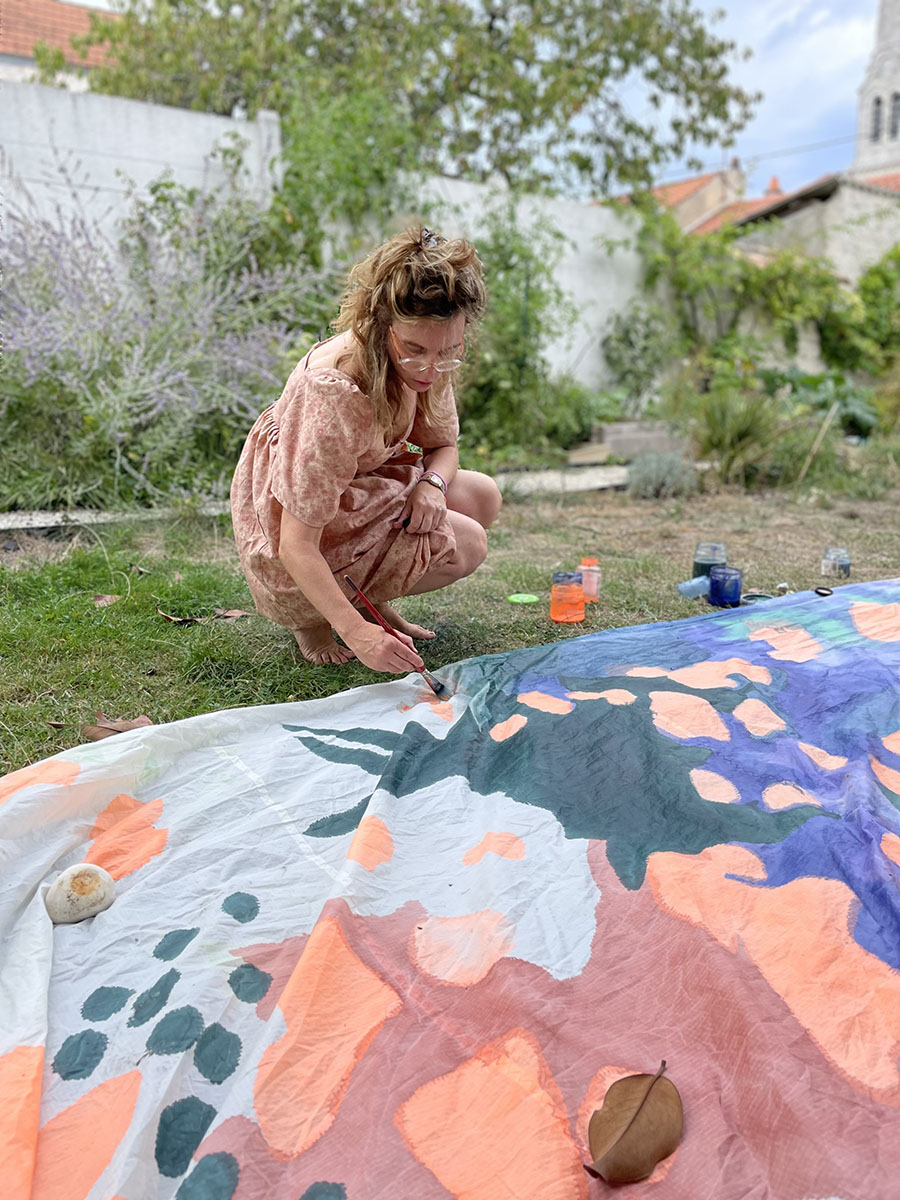 Avec sa palette vive et son regard tendre sur le monde, Sokina Guillemot tisse entre peinture, textile et scénographie des œuvres aussi légères qu'engagées, au fil de collaborations qui font se rencontrer l'art, le social et le vivant.